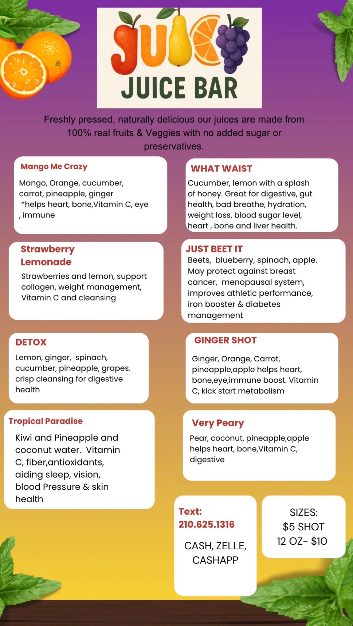 Come to Juicy Juice Bar where you won’t find sugar, preservatives or food coloring! We’re invested in developing a personal connection with each and every one of our customers, by providing quality service and being available to you! Thank you for the relationships that we have formed, and those to come! When you're ready for your journey, we will be with you every step of the way! Can’t wait to meet you!